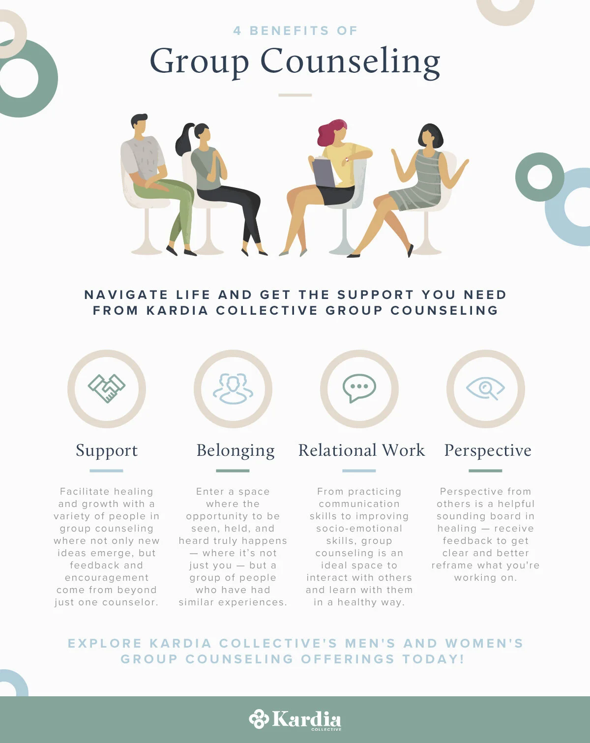 Kardia groups provide a space for individuals to come together and work on their personal and emotional growth in a supportive and encouraging environment. Group therapy is hosted by experienced therapists and coaches in Memphis who are dedicated to helping people create positive change in their lives. Each group offers a unique curriculum with different goals and objectives, as well as varying lengths of time. These groups can range from week-long intensives to month-long programs, and they are often available on a rotating basis so that people can join when it's most convenient for them. Kardia group counseling in Memphis provides a safe and supportive space to explore and develop new skills, build meaningful relationships, and gain a better understanding of oneself.